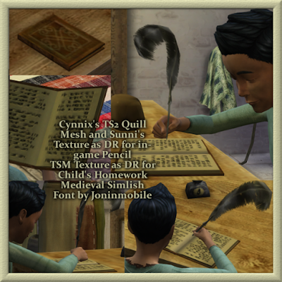 Regarding the quill, you will find that when kids (do any other sims use the pencil? I haven't seen it) go to chew on their quill, as if it were a pencil, it will go through their head. In testing I found they only do this once when they sit and do their homework beginning to end. I think it's a small price to pay for such a beautiful mesh.